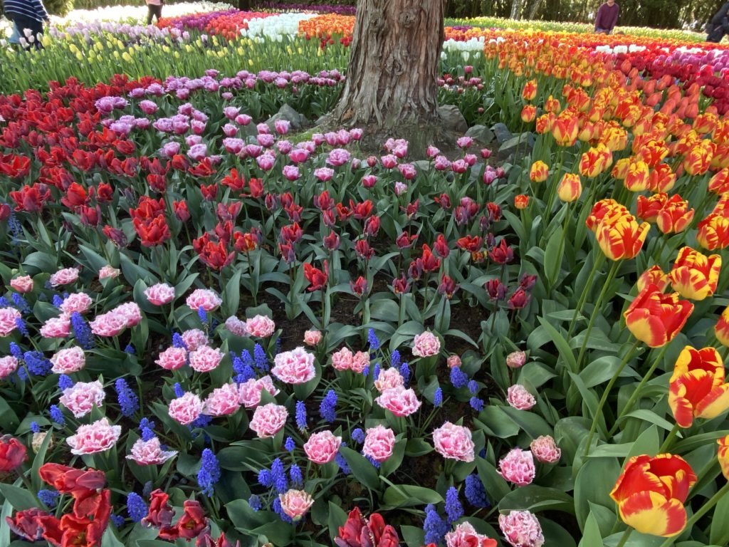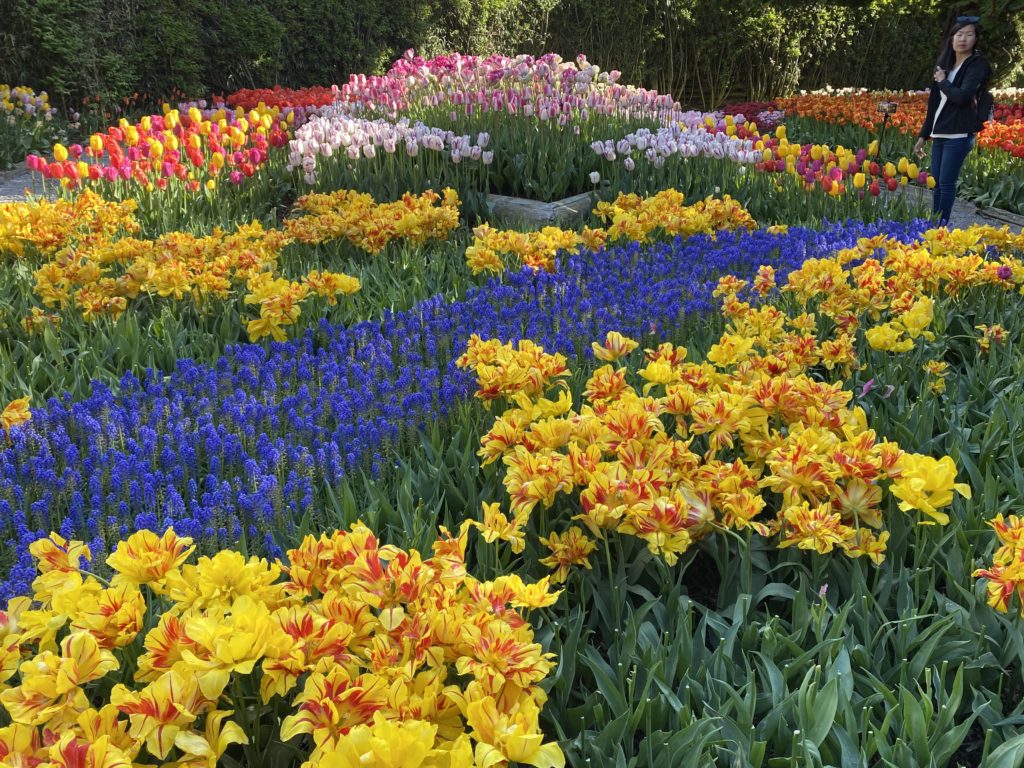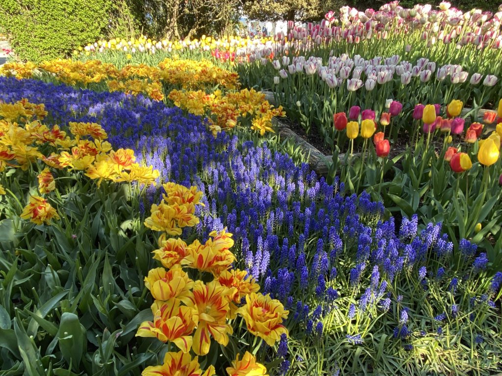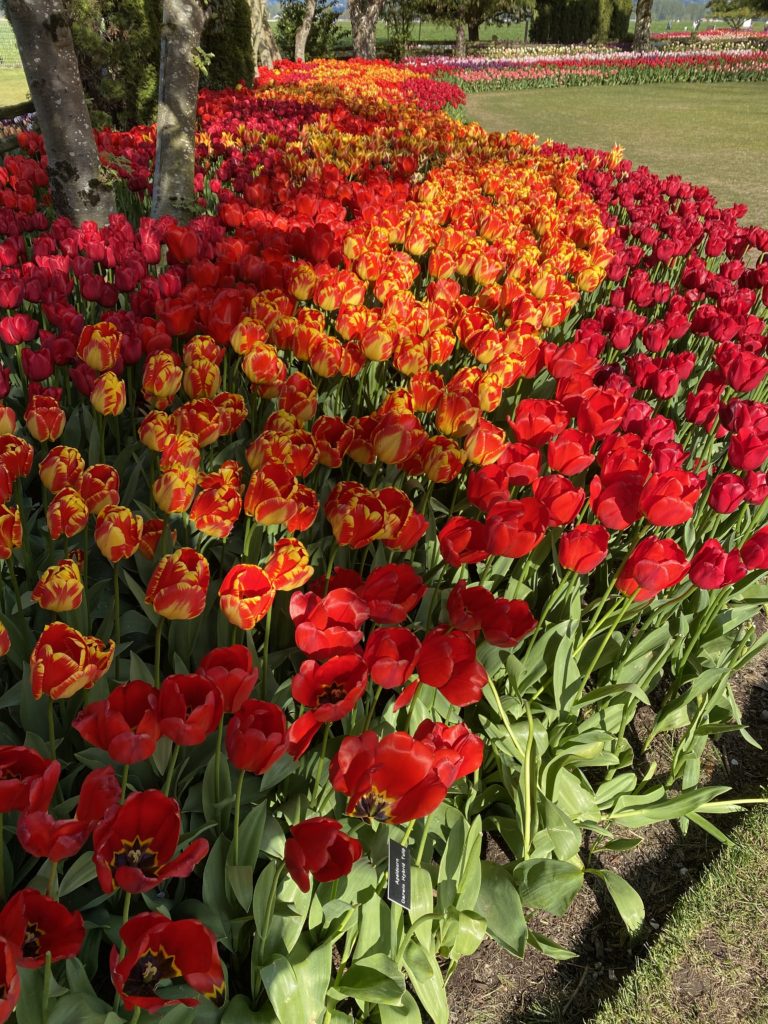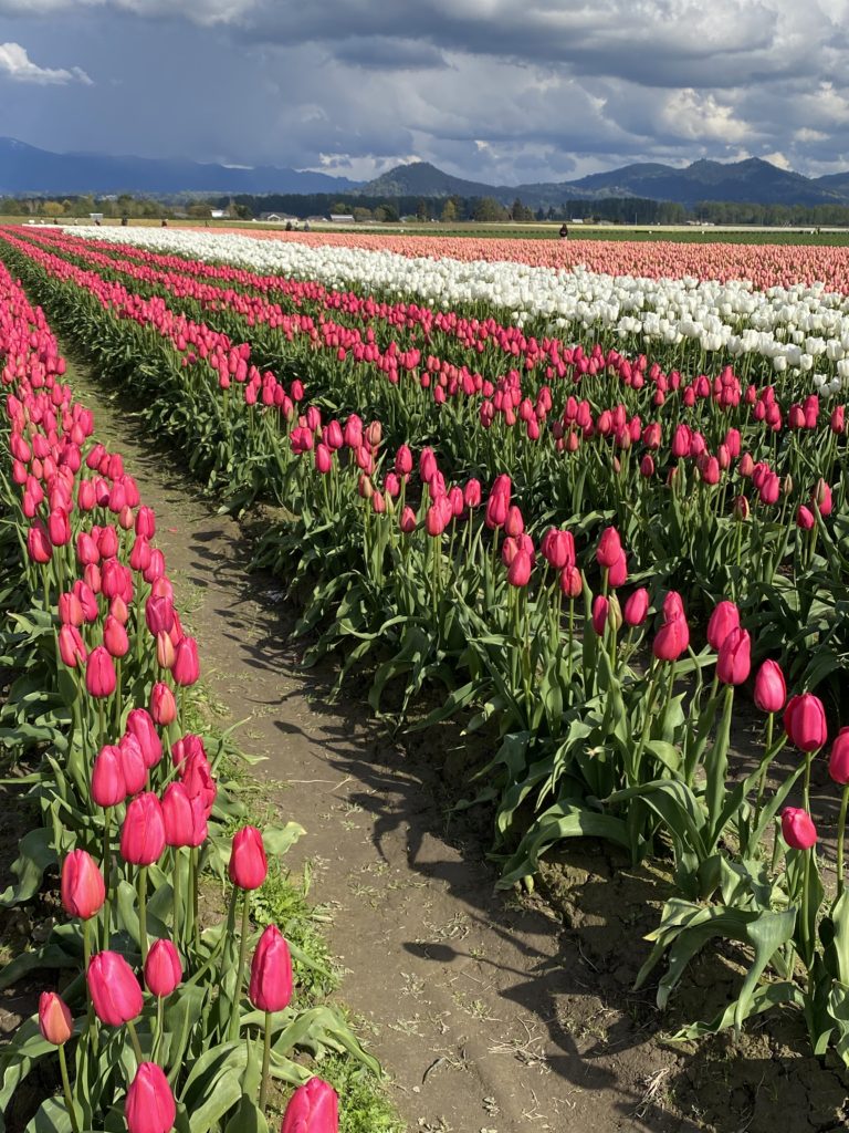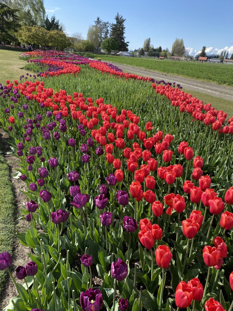 Ray notices in a visitor’s guide that the Skagit Valley tulip festival is going on and it is just up the road in Mt. Vernon. We’ll check it out with hopes we can get in today but as we drive over, we see multiple fields already topped off. Are they still in full bloom, we wonder? The parking lot is full…people are going in…and we see fields of color. It takes our breath away. I’ve always pictured being in Amsterdam for tulip season and here we are in the midst of tulip season much closer to home. The colorful patterns are magnificent in the sunlight with the Cascades in the background. Pure chance in timing. Sometimes you just end up in the right place at the right time.
