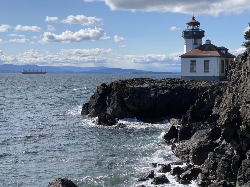 The Washington Ferry System is amazingly well organized. Vehicle reservation in hand, we line up and are out of the harbor right on time. From Annacortes, the ferry meanders through the strait, past Orcas Island, stopping at the heavily forested Lopez Island before ending the journey at Friday Harbor on San Juan Island. We head out to the western coast, through lush woods, green rolling farmland, past alpaca farms and to the coast overlooking the east side of Vancouver Island. The area below a lighthouse is frequented by whales and other sea mammals. We see a sea lion but no Orcas today. The old English soldiers camp sits in a picturesque cove and the walking paths are pleasant. Huge billowing clouds make for a cool, breezy beautiful day.