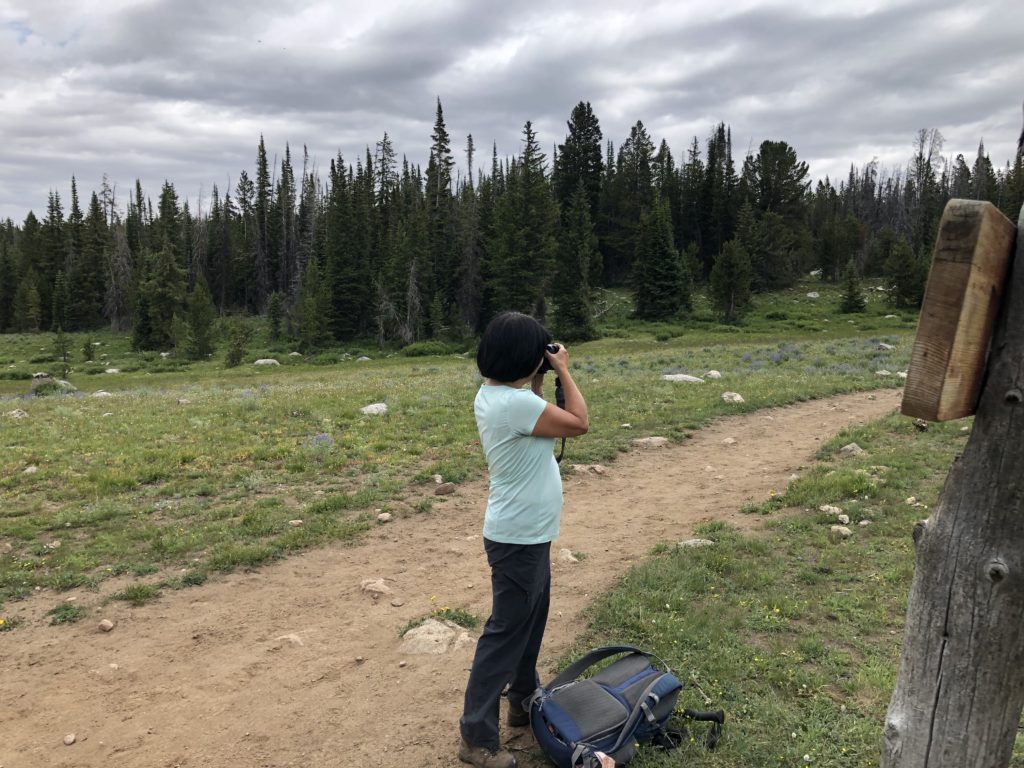 At mid day, we reach the summit at 11,796 ft. in elevation. The Alpine Visitor’s Center is a refuge from the gusty cold wind. I try to photograph from the deck but the winds are too strong. From inside, I can see a bull elk and his harem in the distance. It is rutting season in the Rockies.
