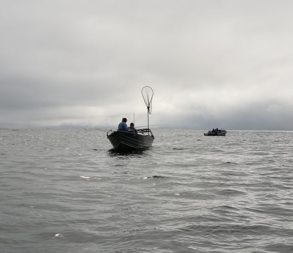 Alas, the fishing gods were not smiling on us today. Under clear blue skies and warm temperatures, we trolled up and down the bay for 8 hrs, getting two nibbles and catching a shimmering green colored wild silver salmon that we had to release. No fish for dinner!